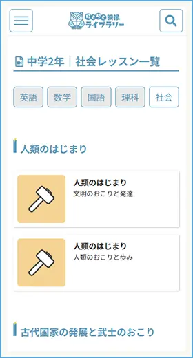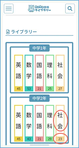 TOPページの本棚からは選んだ学年・科目のレッスン一覧が見られるよ。