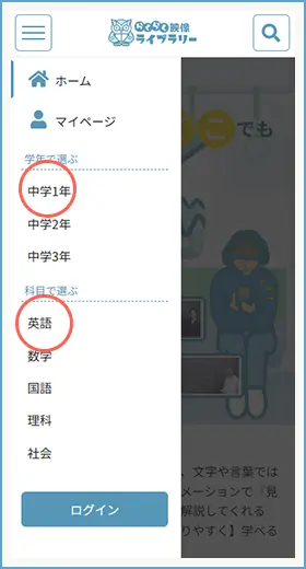 メニューから【学年で選ぶ】または【科目で選ぶ】からはじめてみてね。