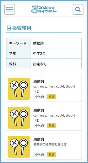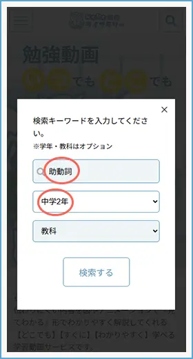 キーワードに『助動詞』と入力、学年を『中学2年』を選択すると一覧が表示されるよ。